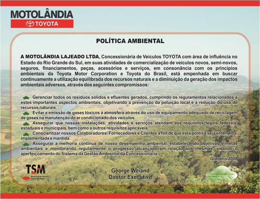 Através de um trabalho exclusivo da equipe da AMBIENTAR CONSULTORIA AMBIENTAL, a MOTOLÂNDIA LAJEADO, Revenda Toyota, conquistou em março de 2009 a Certificação Ambiental Internacional ISO 14001. Após um longo trabalho de Diagnóstico Ambiental, identificação dos principais Aspectos e Impactos Ambientais, estabelecimento da Política Ambiental da empresa, definição de Objetivos e Metas Ambientais e criação de seus respectivos Planos de Ação, além da realização de inúmeros Treinamentos, implementação da documentação necessária, Homologação de Fornecedores, Auditorias Internas e adequação aos Requisitos Legais vigentes, a empresa conquistou esta importante Certificação que atesta ser a MOTOLÂNDIA uma empresa alinhada ao importante compromisso socioambiental que a atualidade exige. Já no seu segundo ano de operação, o SGA certificado conseguiu a importante conquista de redução de 80% de seus resíduos sólidos classe I, o que representou uma importante "economia ambiental" e "financeira". Redução no consumo de água e energia elétrica também foi obtida. A empresa relata outros grandes benefícios desta implementação: organização e padronização de procedimentos operacionais, qualificação e motivação dos Colaboradores através dos treinamentos, economia de insumos e no tratamento de resíduos, influência positiva a Clientes, Colaboradores e Fornecedores, bem como agregação de maior valor ainda à marca e aos serviços prestados pela Concessionária. O sistema já passou por inúmeras Auditorias Internas e Externas, tendo obtido sua Recertificação em 2012. A AMBIENTAR acompanhou esta evolução do SGA em busca da MELHORIA CONTÍNUA através de consultoria técnica constante.